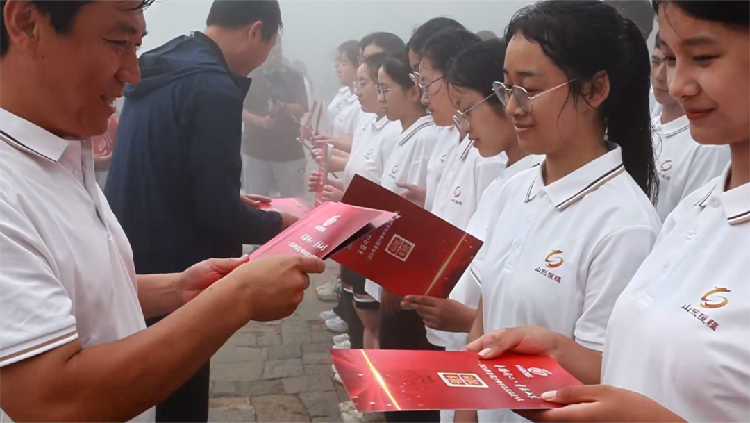 啟動(dòng)儀式結(jié)束后,青少年們乘坐“民族團(tuán)結(jié)號”至中天門,共同攀登泰山,感受泰山文化的博大精深。在岱頂大觀峰,泰岳青少年面向國旗莊嚴(yán)宣誓,“泰山長者”為他們頒發(fā)“成人證書”。