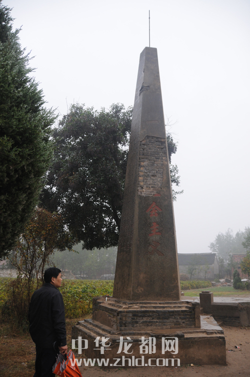 ????在秋雨中,我們走進(jìn)陵頭崗村北頭的普理小學(xué),這是所普及革命真理的紅色校園。在青松和古柏的映襯下,校園操場中央矗立的三崗革命根據(jù)地紀(jì)念塔顯得更加莊嚴(yán)肅穆,塔身正面刻寫著“為了革命事業(yè)的勝利,英勇犧牲的英雄們千古不朽”21個(gè)大字,塔身背面的字跡雖然已經(jīng)模糊,但仔細(xì)辨認(rèn)還能看到這樣一段話:“河南省老根據(jù)地建設(shè)委員會(huì)為了培養(yǎng)老區(qū)人民的后一代,使其繼承革命事業(yè)的優(yōu)良傳統(tǒng),成為社會(huì)主義的建設(shè)者和保衛(wèi)者,乃于一九五六年撥發(fā)款項(xiàng)修葺擴(kuò)建三崗小學(xué),欣值落成用特志其端末,以資留念,時(shí)在一九五七年十月。”遺憾的是,由于年久失修,塔身西北側(cè)上半部已經(jīng)風(fēng)化,刻寫的“一切為了社會(huì)主義”8個(gè)大字只剩下“一”“會(huì)主義”4個(gè)字,覆蓋在塔身中部外層的水泥已經(jīng)脫落,露著磚塊。據(jù)69歲的村民侯民生介紹,1957年10月,普理小學(xué)從陵頭崗村舊址搬遷到此后進(jìn)行了擴(kuò)建,不僅蓋起了當(dāng)時(shí)全縣一流的校舍,還在校園正中心建起了這座紀(jì)念塔。