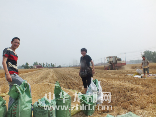 ??? 昨日,鄲城縣小麥?zhǔn)崭罾_(kāi)序幕。圖為該縣城郊鄉(xiāng)小麥?zhǔn)崭瞵F(xiàn)場(chǎng)。(記者 盧好亮 通訊員 孫守功 攝)
