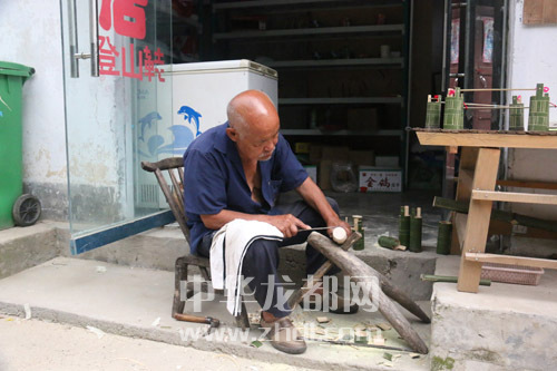 寫(xiě)滿滄桑的臉上,全神貫注,有力的雙手,在竹筒上一刀刀刻著對(duì)生活的美好追求!