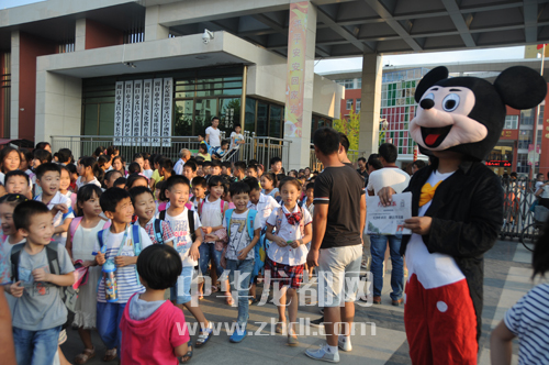 ????9月1日17時(shí)許,在慶豐路周口市文昌小學(xué)門前,家長們看到周口晚報(bào)工作人員在派發(fā)禮品,紛紛掏出手機(jī),掃描二維碼關(guān)注周口晚報(bào)微信公眾號(hào)(圖一)。17時(shí)40分,放學(xué)的孩子們排著整齊的隊(duì)伍陸續(xù)走出校門。校門外,由周口晚報(bào)記者扮演的米老鼠和唐老鴨“大玩偶”吸引了孩子們的目光(圖二)。孩子們興奮地同“大玩偶”玩耍起來。有玩的,還能免費(fèi)領(lǐng)取學(xué)習(xí)用品,孩子們大聲召喚家長加入到掃描二維碼關(guān)注周口晚報(bào)微信公眾號(hào)的“大軍”中來。市民趙先生說:“我是咱晚報(bào)的忠實(shí)讀者,正準(zhǔn)備訂閱明年的報(bào)紙,還打算讓孩子參加晚報(bào)組織的小記者活動(dòng)呢!”
