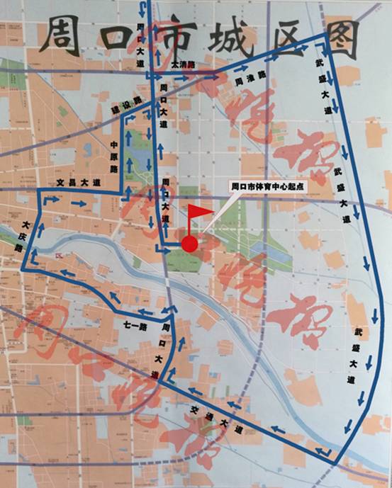 ????賽事初步確定報名參賽總?cè)藬?shù)為1萬人,其中,全程馬拉松2000人,半程馬拉松2000人,迷你馬拉松6000人。比賽路線(如圖)暫定為:市體育中心(起點)——周口大道——北高速口轉(zhuǎn)折——太清路——周淮路——武盛大道——周項路——周口大道——七一路——大慶路——文昌大道——中原路——建設路——周口大道——市體育中心(終點)。