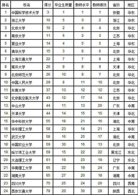 將滿足上述3項條件的大學的3項排名名次相加后升序排列,得分越低越好。得分相同,教師平均學術水平高的大學居前。