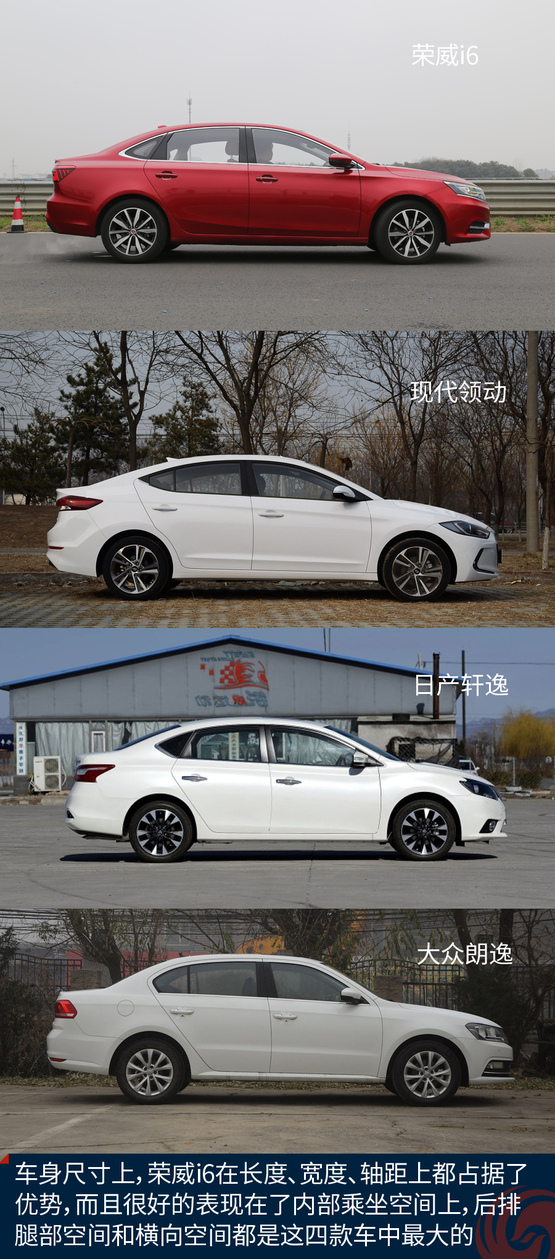 從上面的表格可以看出,榮威i6的長寬高分別為4671*1835*1460mm,在寬度和長度上,都要優(yōu)于其他三款車。特別是車寬,達到了1835mm,橫向的寬度不僅可以提升視覺效果,對車內橫向空間也影響很大,尤其是后排乘坐3人的時候。在軸距上,榮威i6以2715mm的數(shù)據表現(xiàn),穩(wěn)居第一位。