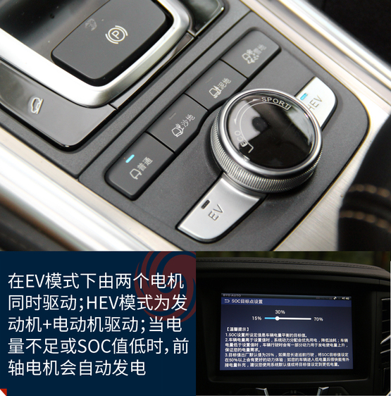 EV的純電模式下車輛由前后兩個電機同時驅(qū)動;在HEV的混動模式下發(fā)動機和雙電機都會提供動力驅(qū)動車輛;當(dāng)電量不足時,前電機則轉(zhuǎn)變成發(fā)電機,發(fā)動機通過前電機為電池充電,同時也為前輪提供動力,此時車輛由發(fā)動機和后電機同時驅(qū)動。