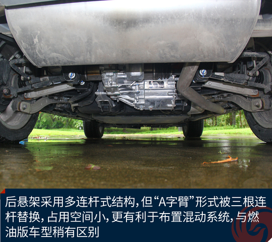 ????????由于電池放置在車輛的底盤和后備廂底部,降低了最小離地間隙。后懸架采用多連桿式結(jié)構(gòu),但“A字臂”形式被三根連桿替換,占用空間小,更有利于布置混動系統(tǒng),與燃油版車型稍有區(qū)別。