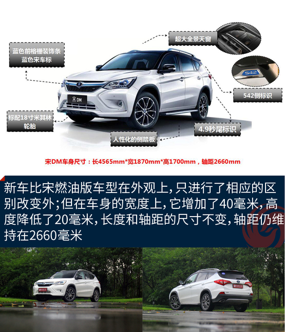 ????????外觀方面,宋DM與燃油版車型基本保持一致,其延續(xù)了X形的前臉造型設(shè)計,整個前臉時尚、運動。而在一些細(xì)節(jié)上,它與唐100一樣,都有新能源車型專屬的特征,車身D柱處還標(biāo)有比亞迪“542”標(biāo)識,并在車尾部標(biāo)有“4.9s”標(biāo)識,強調(diào)了該車型的動力系統(tǒng)較為強大。車身尺寸方面,宋DM車型的長寬高分別為4565×1870×1700毫米,軸距為2660毫米。