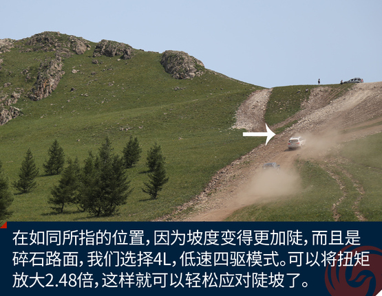 ????????經(jīng)過刺激的涉水越野,我們終于來到了此行最難的挑戰(zhàn)地,傳奇大坡。這條上山的土路從圖片上看起來不陡,實(shí)際上已經(jīng)達(dá)到了45%的坡度。人爬起來都?xì)獯跤?。而且難度大的原因是兩點(diǎn),一個(gè)是超長距離的大上坡,另一個(gè)是后端是碎石路面。你想靠沖坡根本行不通,如果動(dòng)力不足最終是無法登頂?shù)摹8不僅動(dòng)力充沛而且有4L,低速四驅(qū)模式,而且博格華納雙速TOD可以隨時(shí)分配動(dòng)力傳遞到前后軸,保障了有抓地力的輪胎有驅(qū)動(dòng)力。