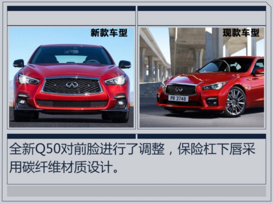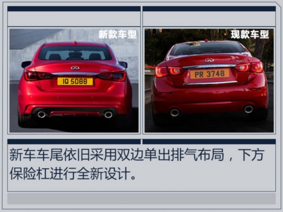 全新英菲尼迪Q50對(duì)外觀進(jìn)行了調(diào)整,前臉采用上下分體式格柵設(shè)計(jì),上格柵為網(wǎng)狀造型,保險(xiǎn)杠下唇為碳纖維材質(zhì)。車(chē)尾取消了車(chē)牌下方鍍鉻飾條以及兩側(cè)反光板,下方保險(xiǎn)杠換裝黑紅雙色護(hù)板。