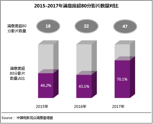截止賀歲檔,2017年滿意度調查的重點國產片數量為67部,其中滿意度高于80分的影片數量為47部,占比超70%;而2015、2016年滿意度超80分的影片總數為40部,占比僅在40%左右。