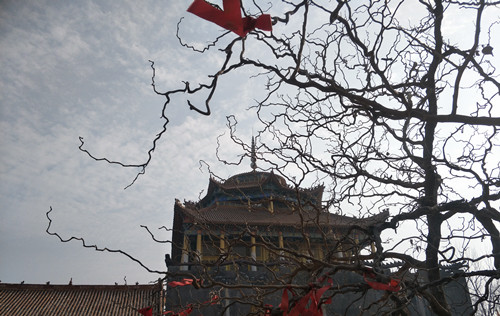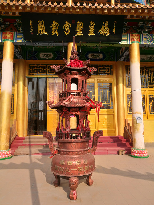 站在昆山女?huà)z宮前向南看,一座高大宏偉的建筑物映入記者眼簾,由于它坐北朝南,我們只能看到它的背影。趙俊明告訴我們,那棟建筑物也是一座敬奉女?huà)z娘娘的大殿,叫做媧皇圣宮寶殿。它是由一位女香客自發(fā)捐資修建的,這座氣派的大殿從無(wú)到有、從小到大整整用了14年時(shí)間,花費(fèi)近千萬(wàn)元。