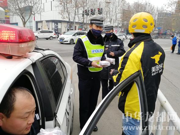 1月24日,在寒風(fēng)中執(zhí)勤的市公安局交通警察管理支隊(duì)直屬一大隊(duì)的交警收到美團(tuán)外賣送來(lái)的臘八粥。