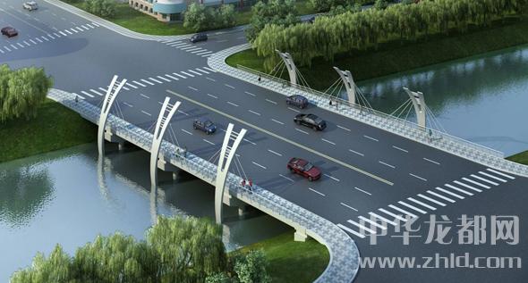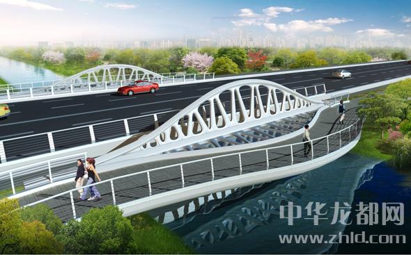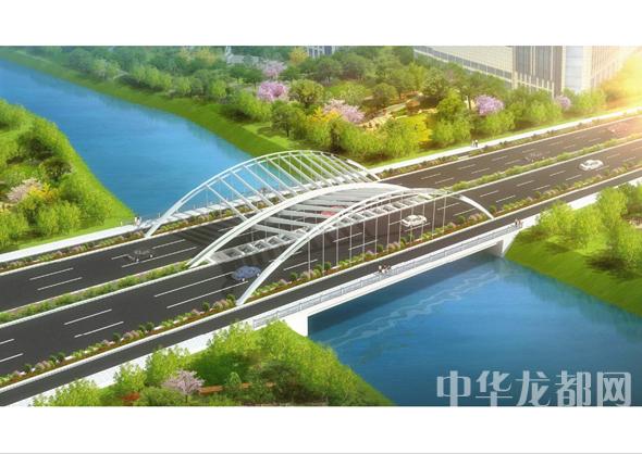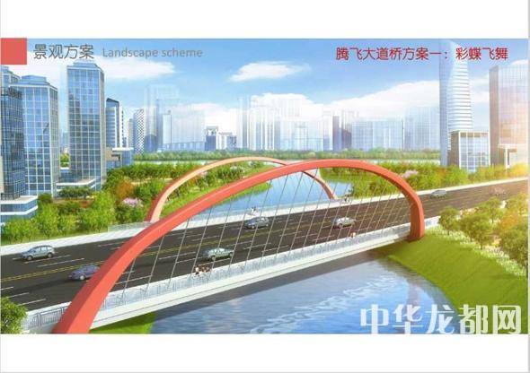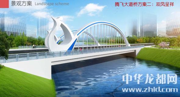 騰飛大道橋的設計方案有兩套,分別為“彩蝶飛舞”和“雙鳳呈祥”。“彩蝶飛舞”為下承式鋼管拱橋,寬36米。記者從效果圖中看到,橋兩側(cè)的拱圈,極具色彩感,給人一種賞心悅目的感覺?!半p鳳呈祥”為裝飾鋼管拱橋,寬36米。該橋采用“雙鳳”造型,象征天下太平,富含吉祥之意。