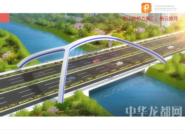 泰山路橋的設計方案有兩套,分別為“錚錚鐵骨”和“梳云掠月”。“錚錚鐵骨”為下承式系桿拱橋。記者從效果圖中看到,其拱體骨架給人一種力量感,拱身視線通透,簡潔明快?!笆嵩坡釉隆睘殇摻罨炷撂峄@拱橋。記者從效果圖中看到,該橋的拱圈造型獨特,簡潔又不失大氣。
