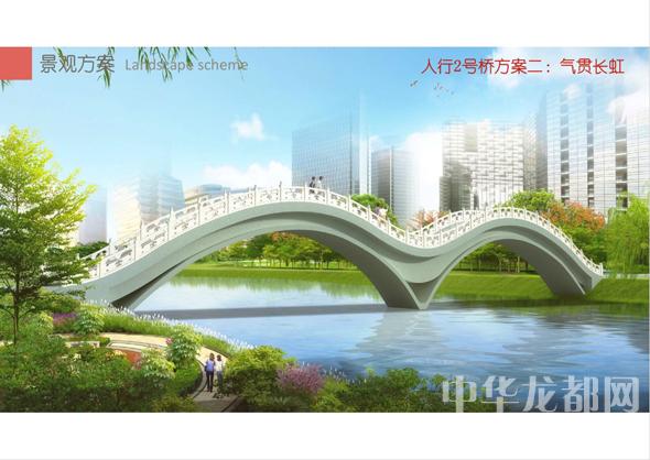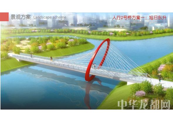 人行2號橋的設計方案有兩套,分別為“旭日東升”和“氣貫長虹”。“旭日東升”為圓形塔懸索橋。記者從效果圖中看到,該橋的橋塔為圓形,猶如一輪東升的太陽,象征著城鄉(xiāng)一體化示范區(qū)蓬勃發(fā)展的未來?!皻庳為L虹”為中承式系桿拱橋。該方案結(jié)合中國玉帶橋的古典元素、抽象古典幾何美學,采用現(xiàn)代的設計手法,創(chuàng)作出現(xiàn)代感和中國傳統(tǒng)橋梁元素雜糅的橋梁設計。