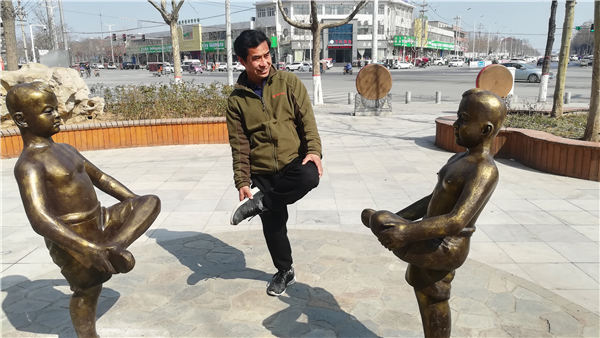 在表現(xiàn)兒童游戲“斗雞”的雕塑前,兩個光背孩童獨腿站立,分別搬著另一條腿作戰(zhàn)斗準備。那生動的畫面,令40多歲的市民尚巖青忍俊不禁,他也獨腿站在雕塑中間,像個開心的孩子一樣,搬著腿和雕塑中的頑童組成一起斗雞的場景。