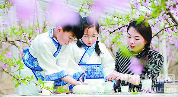 日前,一位年輕的媽媽帶著一雙兒女在扶溝縣韭園鎮(zhèn)的一個溫室大棚基地學(xué)習(xí)茶藝。據(jù)悉,該基地共有11個桃樹溫室大棚和200畝露地桃林。在近1個月的花期里,該基地免費向游客開放。前來賞花的游客不但可以在花間彈古箏、拍照,也可以學(xué)習(xí)茶藝,既欣賞了美景,又陶冶了情操。谷志方 李永超 攝