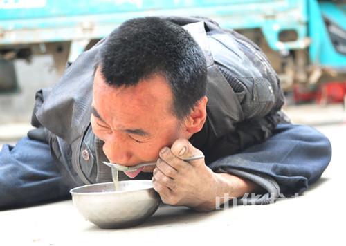 媽媽乘上一碗放在地上,紅印坐在墊子上,用腳夾著勺子,彎下腰來吃得很香??吹郊t印吃飯那么費力,在場人心里酸酸的,為紅印自強不息所打動著??墒钱敵跄飩z可沒少流眼淚,李新蘭發(fā)現(xiàn)兒子兩只腳是靈活完好的,就開始訓(xùn)練他用腳吃飯、洗臉。養(yǎng)大一個正常的孩子尚且不易,何況是張紅印這樣的孩子?李新蘭一遍遍地教,年幼的張紅印一遍遍地學(xué)。難為到受不了時,娘倆就抱在一起哭。