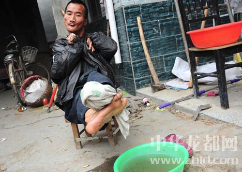 “這孩子40多年來,沒住過院,沒打過針,頭疼發(fā)燒會給媽媽示意,拿幾片藥一吃就好,這孩子命硬,一冬天也不洗回澡,到夏天爸爸媽媽幫他洗洗,有時候衣服一月才換一次?!编従訌埓髬屨f道?,F(xiàn)在紅印可以靈活的用雙腳幫媽媽做一些事情了。
