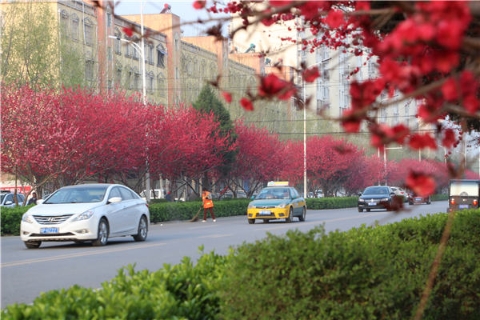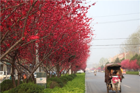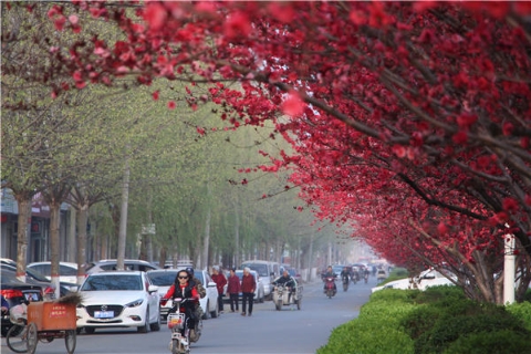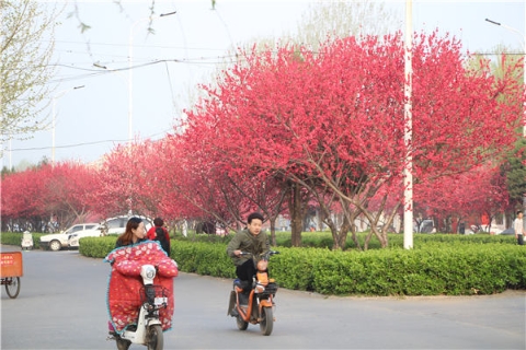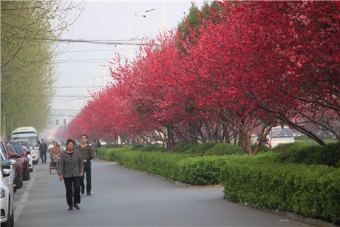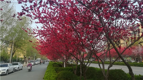 楊樹、垂柳、法桐,這是常見的綠化樹,可是你見過整條道路用桃樹做綠化的嗎?在周口市建設(shè)大道西段,長達(dá)1公里的主干道兩側(cè)種滿桃樹?,F(xiàn)在正值陽春三月桃花盛開,整條道路成了一片花的海洋,儼然是鬧市區(qū)里的世外桃源。
