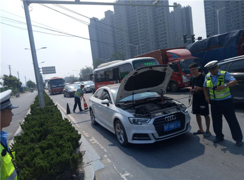 8月26日中午11點,周口港區(qū)公安分局民警發(fā)現(xiàn),一輛私家車行經(jīng)周項路周口港區(qū)路段時,發(fā)生故障停在快車道,影響道路暢通。港區(qū)交警部門負責人姜亞偉上前了解情況,得知汽車電瓶出現(xiàn)故障,無法正常發(fā)動。于是姜亞偉將警車開到私家車旁,用汽車電瓶連接線將警車電池與私家車鏈接,幫助車主啟動汽車,迅速恢復(fù)道路交通秩序。
