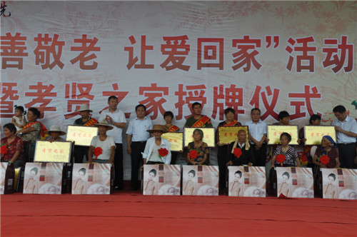 大會(huì)開始之前,來自該鄉(xiāng)20個(gè)行政村的廣場(chǎng)舞代表隊(duì)、戲曲代表隊(duì)、嗩吶代表隊(duì)先后出場(chǎng),訾秀玲一曲《黃土高坡》贏得全場(chǎng)觀眾雷鳴般掌聲。緊接著,好兒子、好媳婦代表上臺(tái)為自己的父母磕了3個(gè)響頭,以表達(dá)對(duì)父母養(yǎng)育之恩的感激之情,老人們臉上流露出激動(dòng)和幸福的淚水,現(xiàn)場(chǎng)掌聲經(jīng)久不息??h領(lǐng)導(dǎo)在主席臺(tái)上為36個(gè)孝賢之家授牌,并向獲獎(jiǎng)?wù)弑硎咀YR。據(jù)介紹,該鄉(xiāng)自開展孝善敬老接老人回家活動(dòng)以來,已有200多名獨(dú)居老人被兒子、媳婦接回家居住。為了表彰接老人回家的好兒子、好媳婦和孝賢之家,該鄉(xiāng)組織、策劃了這次大型活動(dòng)。
