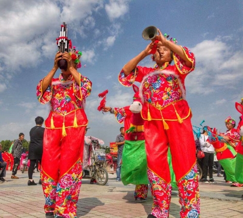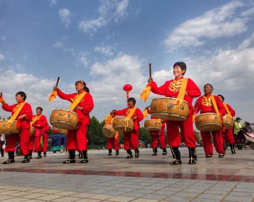 廣場上,一排排碩大的紅氫氣球高懸,氣球下縣掛著祝賀農(nóng)民豐收節(jié)的標(biāo)語。穿著各種鮮艷顏色的表演服裝的民間藝術(shù)表演隊(duì),給節(jié)日增光添彩,擂響盤鼓,為節(jié)日助威。從全縣23個(gè)鄉(xiāng)鎮(zhèn)起早趕來的46支民間藝術(shù)表演隊(duì)伍,伴隨著悠揚(yáng)的音樂,喧天的鑼鼓在廣場上各顯其能。腰鼓、盤鼓、耍獅子、劃旱船、抬花轎、挑花籃、廣場舞也以不同的方式表達(dá)著豐收的喜悅。
