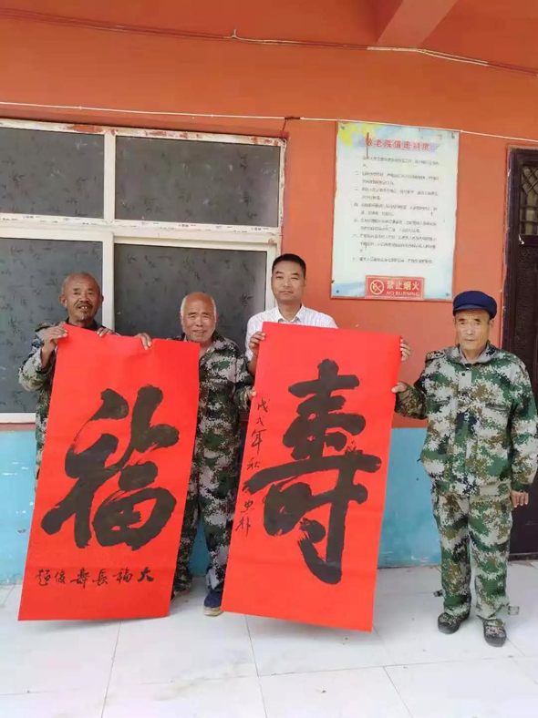 鄲城縣衛(wèi)計委駐虎崗鄉(xiāng)虎崗行政村第一書記王忠樸,是鄲城縣書法協(xié)會副主席兼秘書長,在他的牽線下,鄲城縣書法協(xié)會主席巴云山帶領(lǐng)10多名書法協(xié)會會員前來助陣,與敬老院里懂書法的老人一起揮毫潑墨。