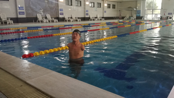 在交談中記者了解到,島建書在5歲時觸高壓線造成雙臂截肢?!?2歲那年,我在電視上看別人游泳,覺得別人能做到的我也能做到,從那時起我就決定學(xué)習(xí)游泳。”島建書說,當(dāng)時沒有條件,他就在河里自學(xué),期間還兩次溺水,所幸被人救起。
