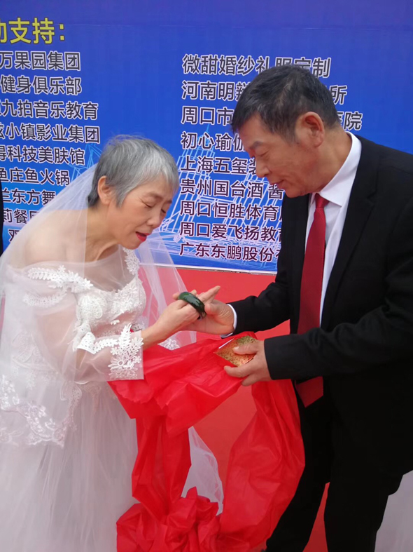 10月19日上午,在周口宏德養(yǎng)老孝道文化節(jié)上,18對老人身著盛裝參加老年集體婚禮。典禮開始后,18對老人手牽紅絲帶走上舞臺,經(jīng)過現(xiàn)代式結婚典禮流程后,老人們互贈禮物。老人們非常激動,他們相互擁抱,有的還流下了眼淚。臺下的子女也激動萬分,紛紛走上舞臺與自己的父母擁抱在一起。