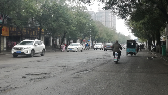 11月8日,記者現(xiàn)場采訪發(fā)現(xiàn),中州大道和人和街交叉口以北路段,路面瀝青剝離脫落、布滿大大小小的坑,碎石子散落滿地,車輛經(jīng)過時(shí),都不得不減速繞行。