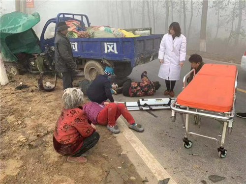 行至不遠(yuǎn)處,他們隱約發(fā)現(xiàn)前方有障礙物,并聽到有人呼救。王和平和同事立即下車走進(jìn)一看,只見一輛農(nóng)用三輪車和一輛電動三輪車相撞,電動三輪車被撞到路邊一顆樹上,整個車身被撞傾斜,事故現(xiàn)場有 4人東倒西歪地躺在地上,傷情不明。