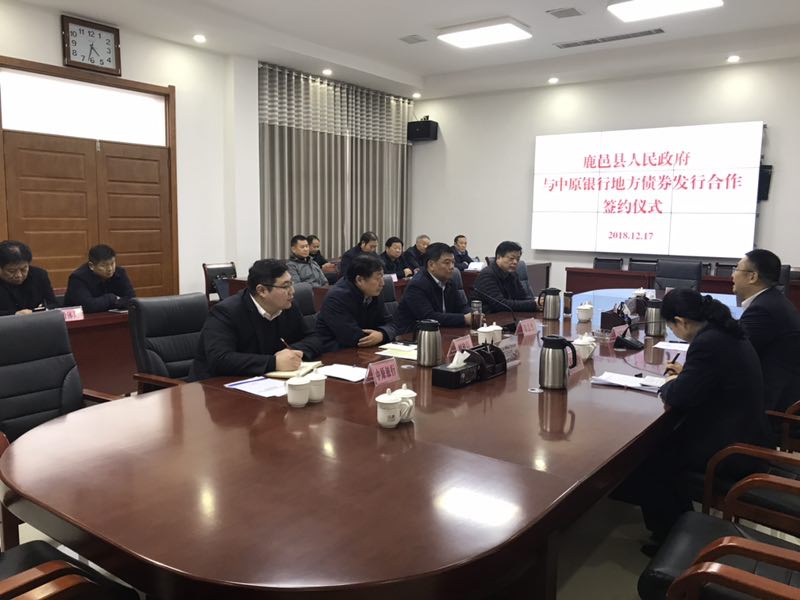 12月17日,鹿邑縣人民政府與中原銀行地方債券發(fā)行合作簽約儀式舉行??h委常委、常務(wù)副縣長陸志杰,老子學(xué)院黨組副書記、交通局局長王初立,中原銀行周口分行黨委副書記、副行長周朝陽出席簽約儀式??h財(cái)政局、教體局、住建局、林業(yè)局、發(fā)改委、老子文化產(chǎn)業(yè)園及投資公司等相關(guān)單位負(fù)責(zé)同志參加會議。