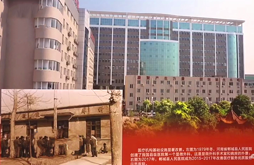 河南電視臺(tái)記者陳貞君在展覽板前介紹,這里是位于第四展區(qū)的兩幅同一所醫(yī)院的照片——河南省鄲城縣人民醫(yī)院,這張是1979年冬天,鄲城縣人民醫(yī)院創(chuàng)建了我國縣級(jí)醫(yī)院第一個(gè)顯微外科,這就是當(dāng)時(shí)的顯微外科的手術(shù)室和病房的外景,這張是2017年的鄲城縣人民醫(yī)院??梢哉f改革開放讓同一所醫(yī)院有了滄海桑田般的變遷。