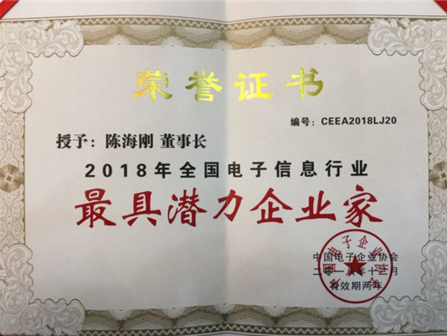 在當(dāng)日下午召開(kāi)的全國(guó)電子信息行業(yè)優(yōu)秀企業(yè)家表彰大會(huì)上,公司董事長(zhǎng)陳海剛榮獲“2018年全國(guó)電子信息行業(yè)最具潛力企業(yè)家”榮譽(yù)稱(chēng)號(hào)。