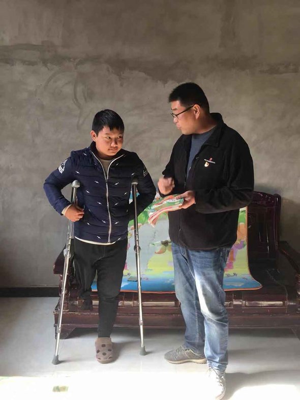 2018年10月4日,李霄在北丁莊村走訪,發(fā)現(xiàn)丁振偉輟學(xué)在家。原來(lái),丁振偉在縣城一所民辦學(xué)校讀書,成績(jī)優(yōu)異,七年級(jí)時(shí)患病,四處求醫(yī)一年多,最終右腿高位截肢才保住性命,一直在家休養(yǎng)。