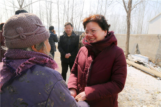 2018年5月11日,張穎波在看望大新鎮(zhèn)陳樓村的困難群眾吳鳳蓮時,曾對她說過一句話,“等你新房蓋好,我再來看你。”76歲的吳鳳蓮把這句話牢牢地記在了心里。一見張穎波的面,拉著手留著淚連聲說:“俺家房早就蓋好了,就一直盼著恁來。我知道恁忙,可就想讓恁看看俺的房……”老人和一位患病的兒子一起生活,去年5月份張穎波來時,她家正因“危房清零”活動而扒掉舊房蓋新房。張穎波當(dāng)時還特意滿足了老人的一個愿望,安排村干部為她家房內(nèi)專門壘個隔斷?!拔遥罚岸嗔?,從來沒住過這么好的房、從來沒過過這么好的日子!”新建的三間磚瓦房、一間配套齊全的廚房和壘好的院墻讓老人感慨不已,發(fā)自肺腑地說著黨和政府的好?!袄先思?,我今天就是想看看房子改造的怎樣,也給你拜個早年。”張穎波拉著吳鳳蓮老人的手說:“房子蓋好了,也算了了你的一個心愿,有黨和政府的幫助,日子會越來越好。你要照顧好自己和孩子,有啥困難就找村里干部。”