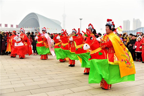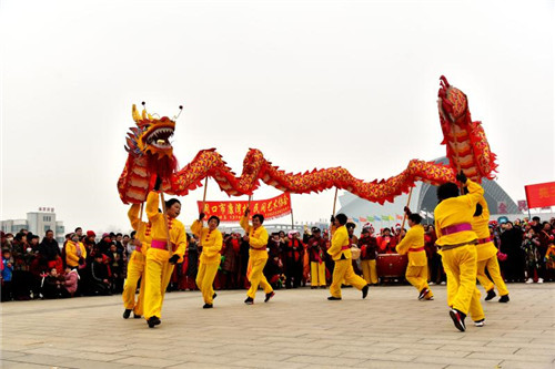 展演現(xiàn)場,人頭攢動,鑼鼓喧囂,16名身穿金黃、亮藍衣服的舞龍隊員率先登場,金燦燦的巨龍時而甩尾前行,時而昂首盤踞,浩浩蕩蕩;8只舞獅歡騰雀躍、活靈活現(xiàn);精美的裝飾的旱船穿行其中,老生、老旦扮相的隊員邊走邊唱;整齊劃一的腰鼓隊以及隊形優(yōu)美的擔(dān)經(jīng)挑把現(xiàn)場氣氛推向高潮……持續(xù)近2小時的展演活動中,精彩的民俗表演令人目不暇接,為這座城市增添了濃濃的年味。