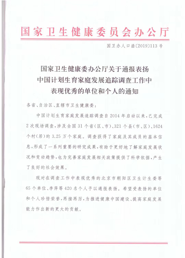 通知顯示,中國計劃生育家庭發(fā)展追蹤調(diào)查自2014年啟動以來,已完成2次現(xiàn)場調(diào)查,涉及全國31個?。▍^(qū)、市)、321個縣(市、區(qū))、1624個村(居)的3.25萬個家庭。調(diào)查獲得了家庭及其成員的基本信息,形成了一系列重要的研究成果,有助于更好地了解家庭發(fā)展?fàn)顩r和變動趨勢,也為完善家庭發(fā)展相關(guān)政策提供了科學(xué)依據(jù),產(chǎn)生了良好的社會效果。國家衛(wèi)健委對在此項工作中表現(xiàn)優(yōu)秀的65個單位、420名個人進行通報表揚,希望受表揚的單位和個人珍惜榮譽,再接再厲,為推進健康中國建設(shè)、提高家庭發(fā)展能力作出新的更大的貢獻。