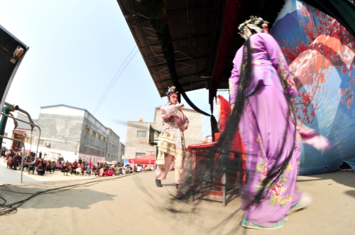 當(dāng)天上午,劇團(tuán)演出的是豫劇《金殿認(rèn)子》,演員們長(zhǎng)年在基層演出,練就一身硬功夫。演員們?cè)谵r(nóng)院內(nèi)化妝,戲服一換,就迅速入戲,生旦凈丑,你來(lái)我往,頗見(jiàn)功底的唱腔及其悠長(zhǎng)的韻味,讓戲迷們看得入迷。