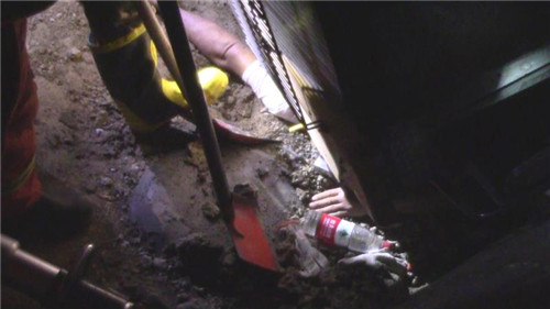 指揮員在與司機溝通時發(fā)現(xiàn),由于車身很重,司機手臂很快出現(xiàn)血液流通不暢、知覺微弱現(xiàn)象,如不及時脫困,后果十分嚴重。情況緊急,救援人員先利用剪擴器對駕駛室與被困人員手臂處進行擴張,但由于車身較重,地面所墊硬物無法承受壓力,擴張器無法發(fā)揮作用。隨后,救援人員利用鐵鍬在被困人員手臂下進行挖土,5分鐘后,隨著空間的逐漸擴大,被困人員手臂被小心翼翼抽回,司機成功脫困,消防指戰(zhàn)員從駕駛證另一側把他救出。