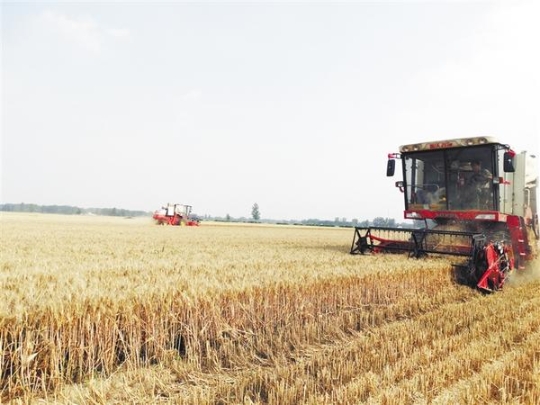 5月28日,沈丘縣周營鎮(zhèn)歐營行政村的麥田里,兩臺大型收割機正在緊張工作。眼下,該縣102萬畝小麥已陸續(xù)成熟,當(dāng)?shù)剞r(nóng)民緊抓有利天氣條件搶收小麥。謝辛凌 攝