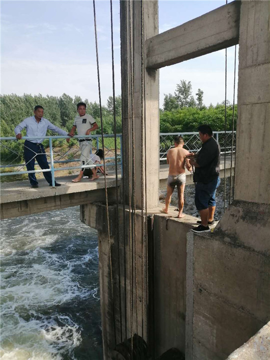 黃興龍邊大聲對(duì)青年男子說(shuō)“堅(jiān)持住,我去拿工具”,邊向100多米外的閘管所跑去。參加過(guò)縣水利局預(yù)防未成年人溺亡培訓(xùn)學(xué)習(xí)的所長(zhǎng)劉浩和職工魏全心、王相等聽到喊聲,立即從辦公室拿來(lái)繩索、長(zhǎng)竹竿等救援設(shè)備,和黃興龍一起跑向出事地點(diǎn)。