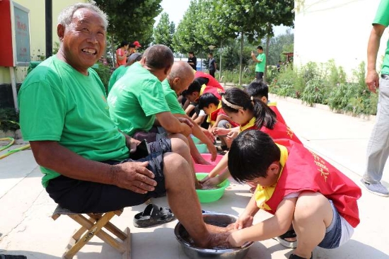 7月的太康,酷熱難耐。6日上午8時許,一輛公交車穩(wěn)穩(wěn)??吭谔悼h芝麻鄉(xiāng)敬老院門口,車上下來20多名身穿紅馬甲的學(xué)生志愿者,他們抬著米、面、油和雞蛋等物品走進敬老院。坐在門口等候的老人們,樂呵呵地上前迎接客人。整個敬老院一下子熱鬧起來。放下物品,孩子們立馬開始勞動,他們從老人們宿舍搬出馬扎、板凳,在院中擺放安穩(wěn),扶著老人坐上去,開始給老人洗腳。正上初中一年級的李博泉細心地幫72歲的張照志老人摳掉趾甲縫和腳底的污垢。張老漢流淚了:“這輩子有人給我洗腳,我真是不知道哪修來的福氣……”