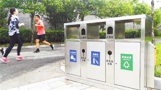 日前,周口公園把原來(lái)的綠色塑料垃圾桶全部換成不銹鋼分類垃圾桶。記者在現(xiàn)場(chǎng)看到,該垃圾桶中間有“外包裝物”“瓶罐類”“其他垃圾”3個(gè)投放口,兩側(cè)設(shè)有“滅煙口”,方便市民分類投放垃圾。