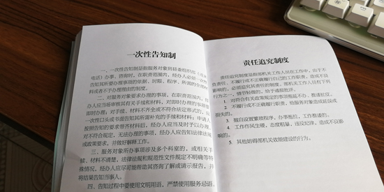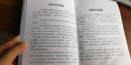 制度規(guī)定,服務(wù)對(duì)象到縣委組織部辦事、咨詢或來(lái)電時(shí),首個(gè)接待的工作人員必須熱情、禮貌、耐心接待辦理或引領(lǐng)交給相關(guān)職責(zé)科室辦理。凡符合規(guī)定,手續(xù)齊全的,限時(shí)辦結(jié),手續(xù)不全未能及時(shí)辦結(jié)的,要主動(dòng)向服務(wù)對(duì)象說(shuō)明原因……縣委組織部常務(wù)副部長(zhǎng)薛斌告訴記者:“通過(guò)扎牢制度的籠子,讓部機(jī)關(guān)工作人員做到一張笑臉迎客,一把椅子讓座,一杯茶水暖心,一顆誠(chéng)心辦事,一流業(yè)績(jī)爭(zhēng)先的服務(wù)標(biāo)準(zhǔn),切實(shí)達(dá)到門好進(jìn)、臉好看、話好聽(tīng),事好辦的目的?!?/p>