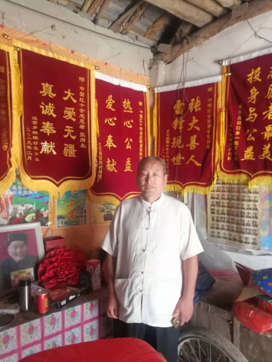 張同生今年65歲,發(fā)揚(yáng)雷鋒精神,處處奉獻(xiàn)愛心,自愿參加河南省紅十字會(huì)志愿者,建立救病扶困基金,為困難病人墊付醫(yī)療費(fèi),幫助病人聯(lián)系醫(yī)院、專家教授治病,辦理住院手續(xù),為病人干的好事實(shí)事,就像秋后熟透的葡萄—一串一串的。病人為他送的錦旗掛滿了3間堂屋,病人為他送的表揚(yáng)信少說也有半尺厚。