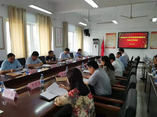 8月23日,鄲城縣召開2019年特崗教師招聘面試考務工作會議,明確分工,強化責任,確??紕展ぷ黜樌???h政府辦公室副主任楊培爭、縣紀委常委趙天位、縣編辦主任王民仰、縣教體局局長劉現(xiàn)營、縣人社局局長劉自忠、縣公安局治安大隊教導員葛染,以及面試工作組全體人員參加會議。