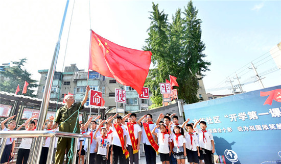 伴著雄壯的國歌聲,30多名孩子目不轉(zhuǎn)睛地看著國旗冉冉升起……為迎接新中國成立70周年,近日,江蘇省揚州市邗江區(qū)雙橋街道文苑社區(qū)在社區(qū)國旗臺廣場,組織開展了開學(xué)第一課“我與國旗合個影、我為祖國添笑臉”活動。鮮艷的五星紅旗、燦爛的孩子笑臉,組成了一幅和諧美麗的畫面。