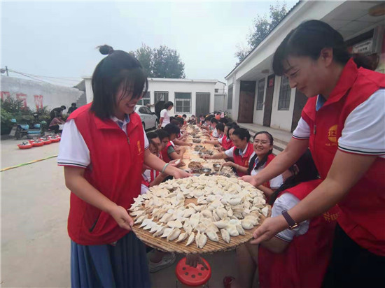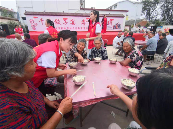 與此同時(shí),在演出現(xiàn)場附近的村委大院內(nèi),由周口市慈孝文化促進(jìn)會(huì)、北斗達(dá)教育集團(tuán)等組成的200多名志愿團(tuán)隊(duì)正忙得不亦樂乎,調(diào)餡、包餃子、下鍋、端盤,兩個(gè)多小時(shí)內(nèi),他們精心包出20000多個(gè)愛心水餃。11時(shí)30分,餃子宴正式開始,老人們一邊吃著水餃一邊觀看者演出,喜笑顏開,呈現(xiàn)出一片相親相敬的溫馨畫面。